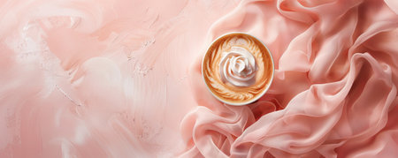 Mockup. Hot caramel macchiato on a light rose background, offering a romantic and delicate backdrop for your creative projects.