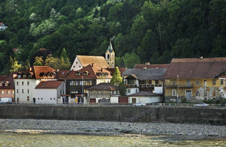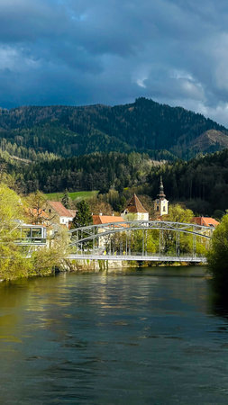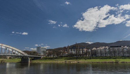 Landscape of Slovenia in Maribor with Drava river. there is Koroski most and Kapucinski samostan church in the background taken from Studentska brv