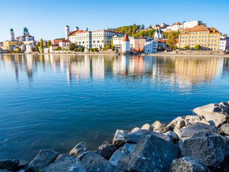 Passau, Germany - July 21, 2023: Panoramic view of Passau. Aerial skyline of old town with beautiful reflection in Danube river, Bavaria, Germany.