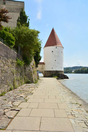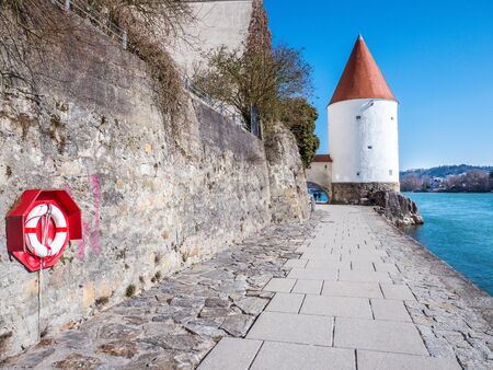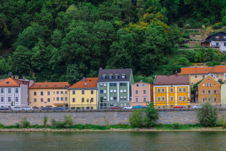 Panoramic view of colorful row of houses at river Danube, Passau, Bavaria, Germany. High quality photo