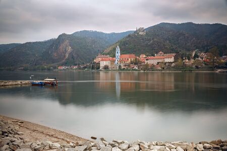 View of the medieval monastery Duernstein on the river Danube in the Wachau valley. Lower Austria