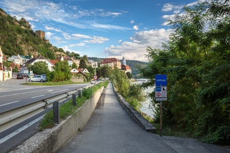 DUERNSTEIN, AUSTRIA - JULY 8, 2018. View of the embankment of the river Danube and the medieval monastery Duernstein. Wachau valley, district of Krems-Land, Lower Austria, Europe.