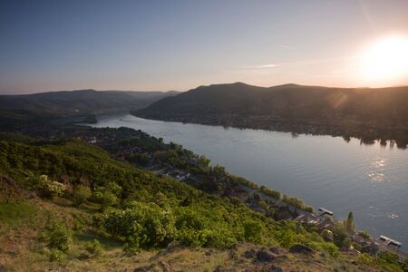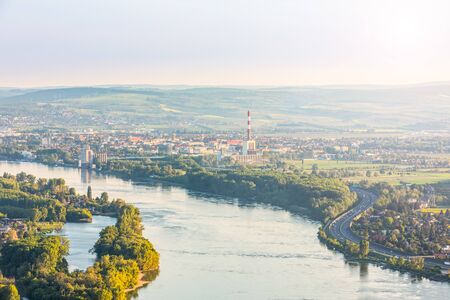 Hainburg an der Donau and Danube river from Schlossberg, Austria. Travel destination. Beautiful place. Urban scene. Cultural heritage.