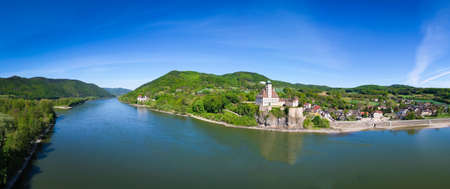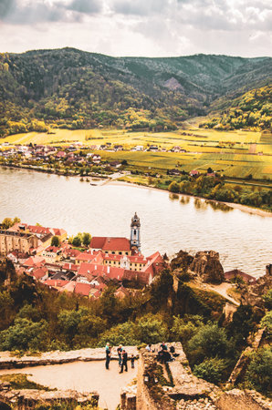 Scenic aerial view of Durnstein Village, Wachau Valley of Danube River, Austria.