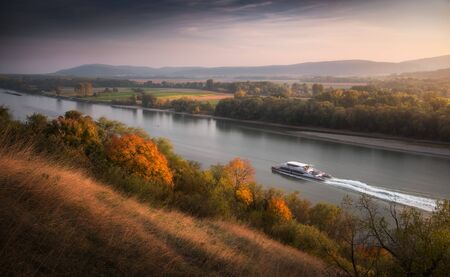 ship on the danube river. View of vineyards in sunset light, Wachau Valley, Austria