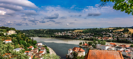 Panoramic view of Passau. Aerial skyline of old town from Veste Oberhaus castle . Confluence of three rivers Danube, Inn, Ilz, Bavaria, Germany.