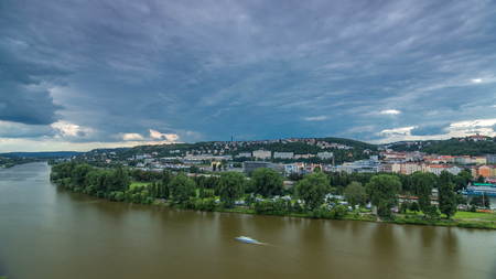 View of Prague timelapse from the observation deck of Visegrad. Prague. Czech Republic. Vltava river and red roofs. Stormy weather with dark clouds