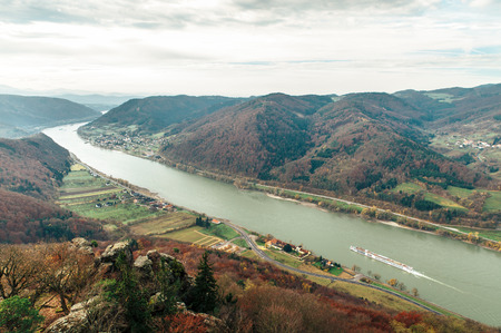 Autumn panorama of Wachau valley (Unesco world heritage site) with ships on Danube river near the Weissenkirchen village in Lower Austria, Austria