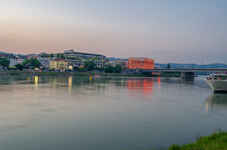 LINZ, AUSTRIA - JULY 6, 2015: Sunset view of the Danube in the city of Linz, Austria, with the new Ars Electronica Center in the background, designed by Treusch architecture ZT GmbH, opened in 2009. Ars Electronica Linz GmbH is an Austrian cultural, educa