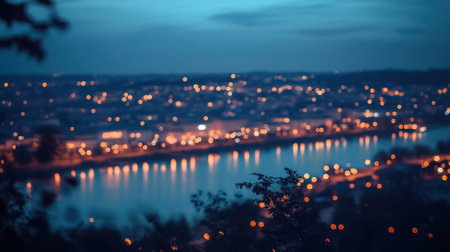 Twinkling lights reflect on the river as the city settles into a calm twilight.