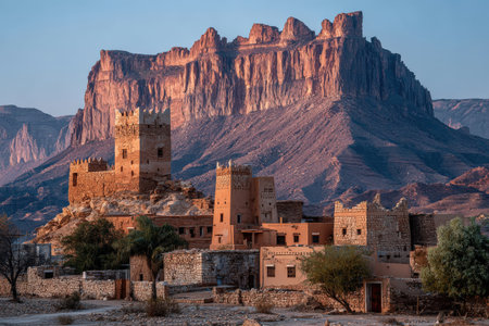 A stunning desert castle stands prominently amidst a rocky landscape. The ancient architecture and dry surroundings create a unique travel destination.