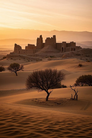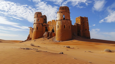 A striking desert castle emerges from the sandy landscape, showcasing ancient architecture against a dramatic sky. Perfect for travel themes.