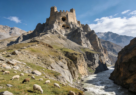 Historic fortress features stone towers and walls, set against dramatic mountain scenery, highlighting the blend of architecture and nature in a serene environment
