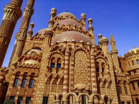 Sharm El Sheikh, Egypt - January 17, 2020: Facade of Al Sahaba Mosque (Sharm El Sheikh) with decorative walls, close-up. Delightful architecture of a modern Muslim temple