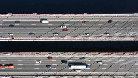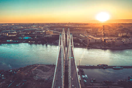 Aerial top view of cable-stayed bridge with cars in St.Petersburg