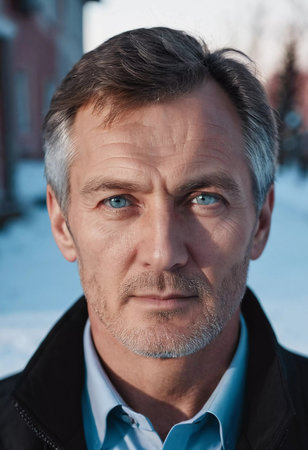 A middle-aged man stands outside in a snowy environment, showcasing his intense blue eyes and thoughtful demeanor. He wears a dark jacket over a light shirt, reflecting the cold Russian landscape. AI.