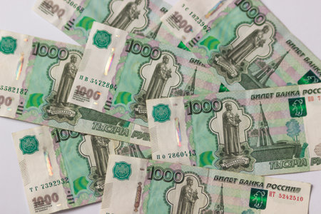Russian money, banknote face value of one thousand rubles. Fall and devaluation of the russian ruble, crisis.