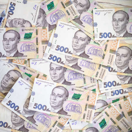 Ukrainian Money backgrounds. 500 banknotes. Hryvnia (UAH). Top view.