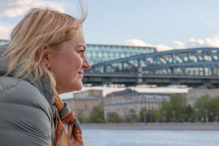 Blonde middle-aged woman in profile stands on embankment and looks at river against the background of city bridge. Wind develops the woman's hair. City walks, reasoning about life.