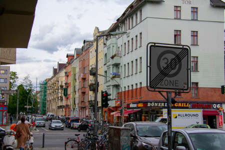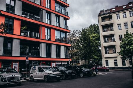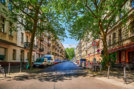 Berlin, Germany - May 11, 2022: Typical cityscape of Berlin-Kreuzberg in the neighborhood of the Bergmann-Street.