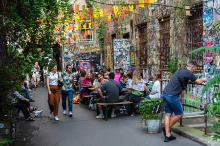 Berlin, Germany, July 20: Street cafe in one of the courtyards of the city, where residents and guests relax in Berlin on July 20, 2023.