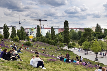 Berlin, Germany - June 8th, 2012: Groups of young adults and teenagers scattered on the grass at Gorlitzer park, located in Kreuzberg, East Berlin, Germany; on a lovely sunny spring day.