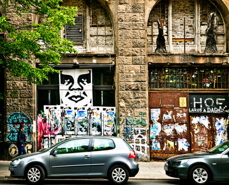 Berlin, cars parked in front of the graffiti covering the facade of Kunsthaus Tacheles in Oranienburger Strasse, former nazi prison, then art center, now closed and in ruin.