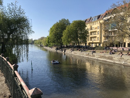 Berlin, Germany - april 2019: People enjoying sunny weather on the street, sitting at riverside in Berlin, Kreuzberg during spring