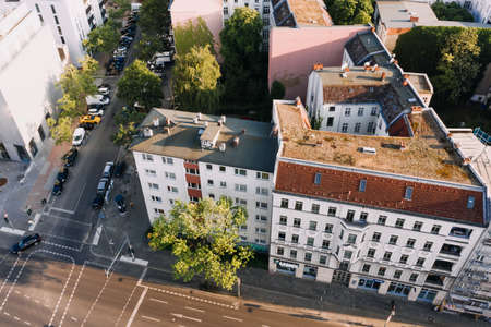 View from high point to the street with buildings with trees in Berlin in Germany. Architecture of the big city.