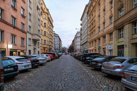 Urban street view with parked cars in residential area at dusk. March 22, 2025 Prague Czechia.