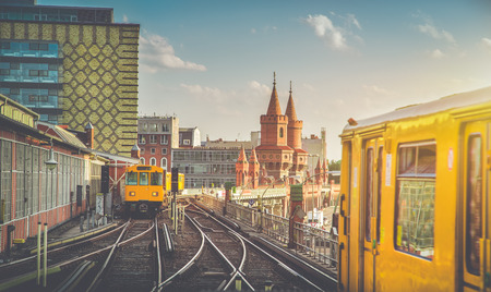 Panoramic view of Berliner U-Bahn with Oberbaum Bridge in the background in golden evening light at sunset with retro vintage style hipster filter effect, Berlin Friedrichshain-Kreuzberg