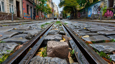 A captivating view of a cobblestone street featuring vintage tram tracks surrounded by colorful graffiti, vibrant autumn leaves, and historic buildings.