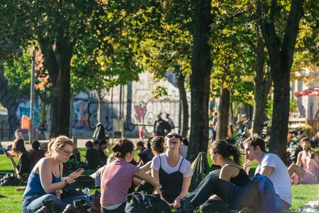 BERLIN, GERMANY - SEPTEMBER 26, 2018: Group of friends talking and laughing while sitting down in a circle at the James Simon Park, next to the Museum Island and behind the Cathedral of Berlin