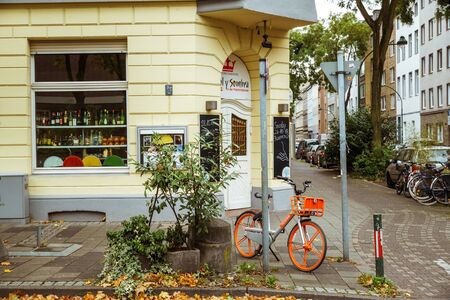 Bicycle Parked On City Street. A city bike in Dusseldorf. Urban bike parked without anyone on European street. Bicycle ecological mode of transport in Europe. Dusseldorf, Germany October 25, 2018.