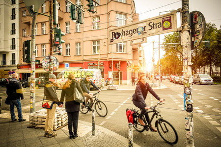 BERLIN, GERMANY - OCTOBER 7, 2016: motion view of everyday life with bikers and pedestrians at beginning of Box Hagener Strasse in the area of Friedrichshain at sunset - Warm vintage vignetted filter