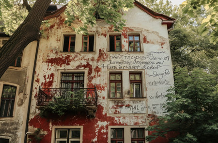Explore a captivating urban street scene featuring colorful murals and historic buildings along a winding cobblestone alley in a vibrant artistic district.