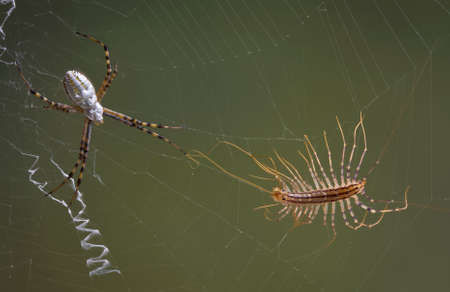 A banded argiope spider has caught a house centipede in it's web.