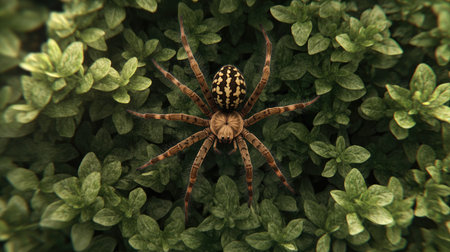 A detailed close-up of a spider resting on vibrant green leaves, showcasing its intricate patterns and natural habitat, perfect for nature and wildlife themes.