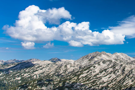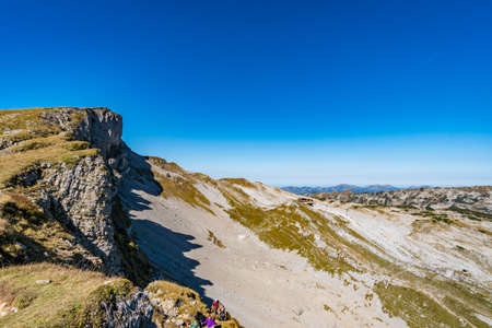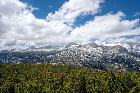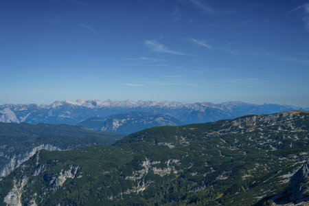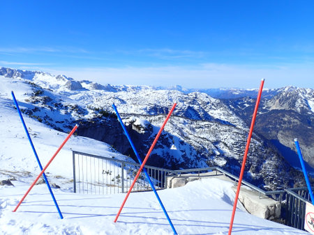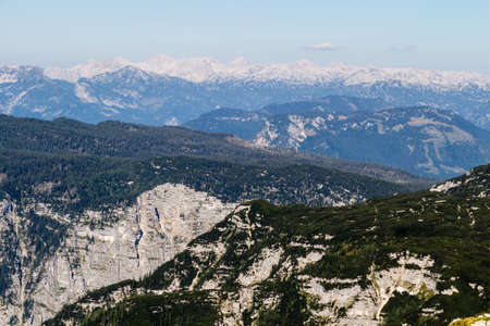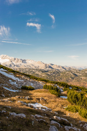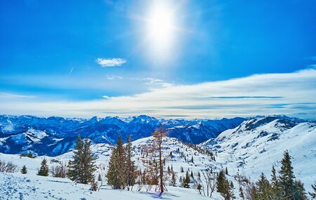 The sunny midday on Feuerkogel Mountain plateau, overlooking rocky sharp peaks of Dachstein massif, snowy slopes and spruce forests, Ebensee, Salzkammergut, Austria