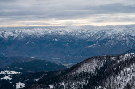 Spectacular winter mountain panoramic view of mountains with clouded sky. Pokljuka, Slovenia.