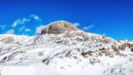 Dolomites - Cima Val di Roda and Cima Rosetta seen from the Rosetta refuge durting winter season and snowy landscape