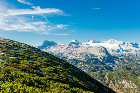 Sportman with white-and-yellow parachute hovers over Mount Krippenstein in upper Austria, enjoying view of valley and rest of the Austrian alps. Ideal sunny weather without gusty winds for paragliding.