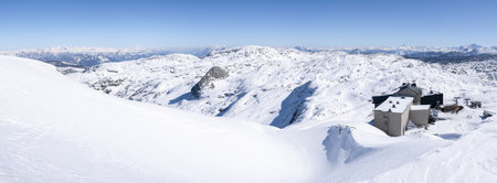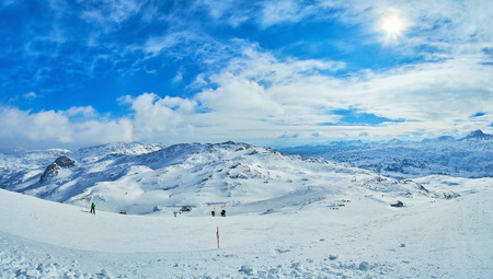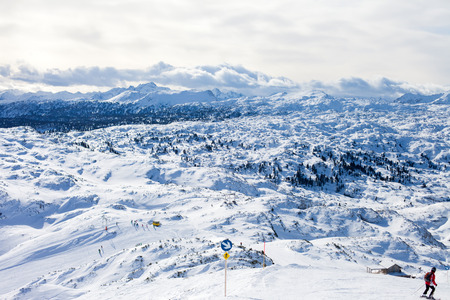 The mountain plateau of Dachstein-Krippenstein is the best place for snowshoers walks, skiing, snowboarding and other extreme winter sports, Salzkammergut, Austria.
