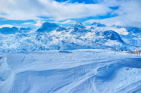 Relax in Alps with a view on snow-white slopes, sharp rocks, peaks of Dachstein massif and clouds, hovering around the mountains, Obertraun, Salzkammergut, Austria.