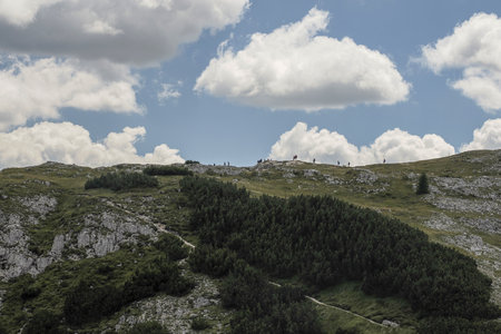long hiking path on the top from a green mountain with grey clouds on blue sky in the summer