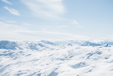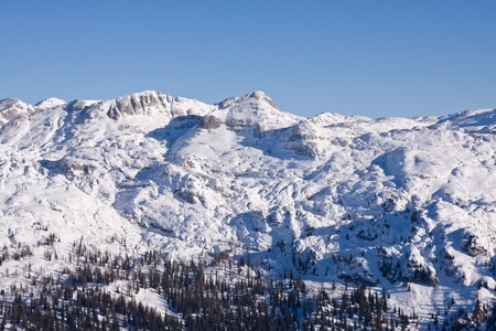 Snowy winter landscape in the Austrian Alps. Rocky plateau covered by sunlight. Bright white light reflected by snow