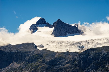 Peaks of Dachstein massif covered by glacier and clouds, Austria