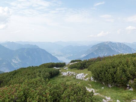 Panoramic summer view of Dachstein Mountains taken from Krippenstein cable car station, Salzkammergut region, Upper Austria, Austria