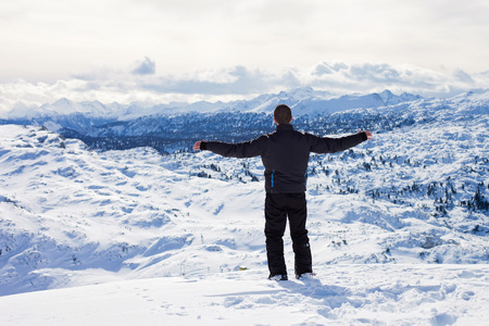 Young skier, enjoying the view from top of mountains in Austrian ski resort on a sunny winter day, happiness and freedom concept
