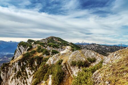 Panorama of Krippenstein mount and overlooking rocky peaks of Dachstein Alps, Salzkammergut, Austria